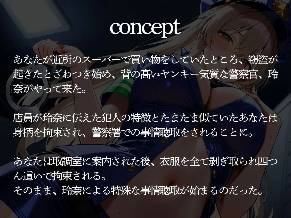 あなたが近所のスーパーで買い物をしていたところ、窃盗が起きたとざわつき始め、背の高いヤンキー気質な警察官、玲奈がやって来た。